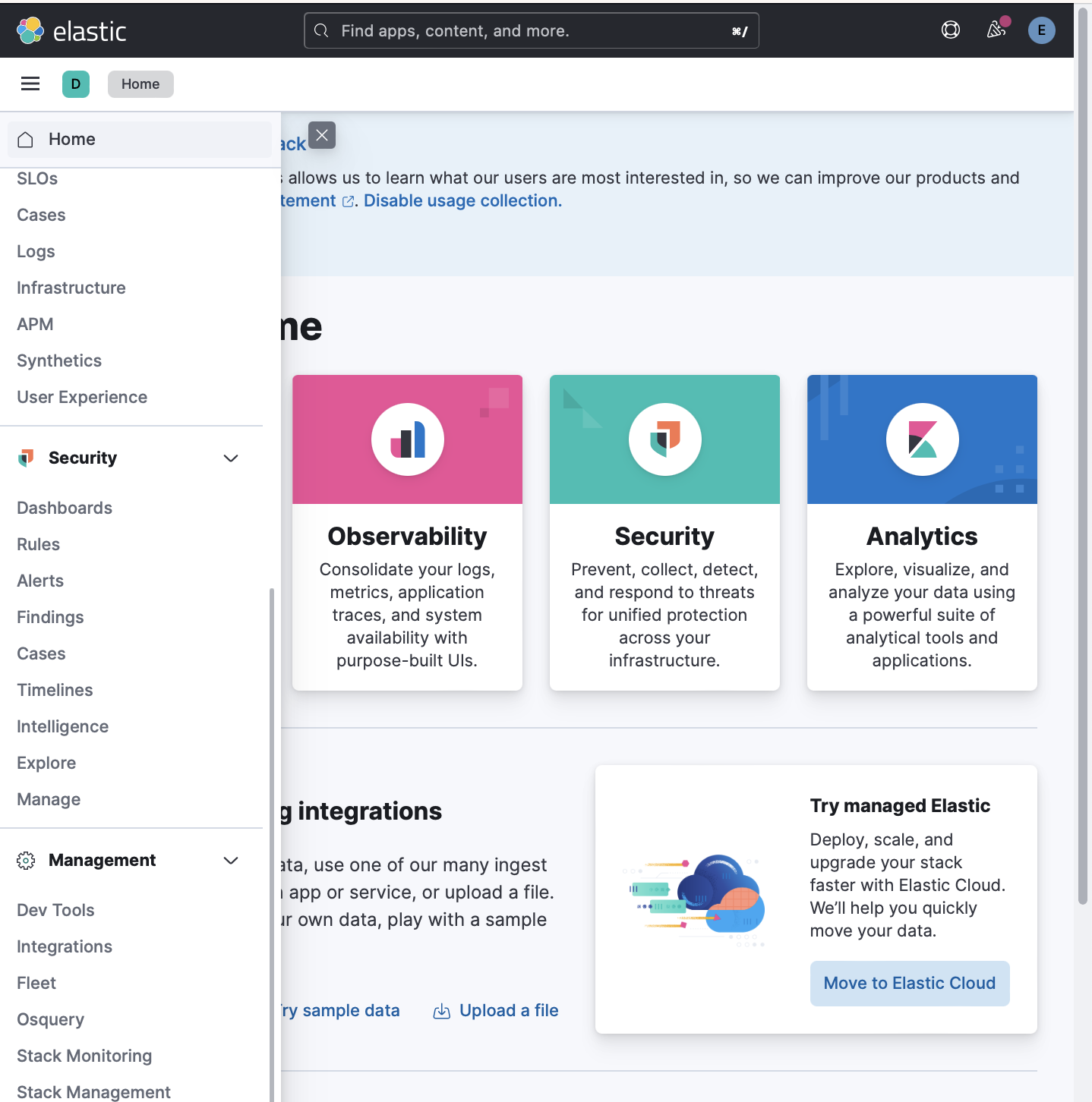 localhost:5601로 들어가게되면 다음과 같이 kibana페이지를 볼 수 있다