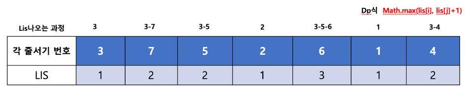 - 그러면 이제 N개의 수들중에서 LIS를 제외하고 위치를 변경해주면 해결된다. 아래 예시처럼 N=7, 3 7 5 2 6 1 4면 LIS는 3-5-6이 되고 7,2,1,4의 위치를 변경해주면된다. 따라서 답은 4가 된다.